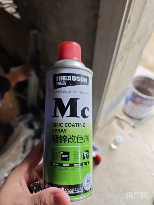 记者在湖北剔祥建筑工程有限公司(施工劳务)位于某城中村的项目部看到现场有镀锌改色剂,现场人员表示会用此喷涂镀锌钢管(总台中国之声记者 管昕摄)